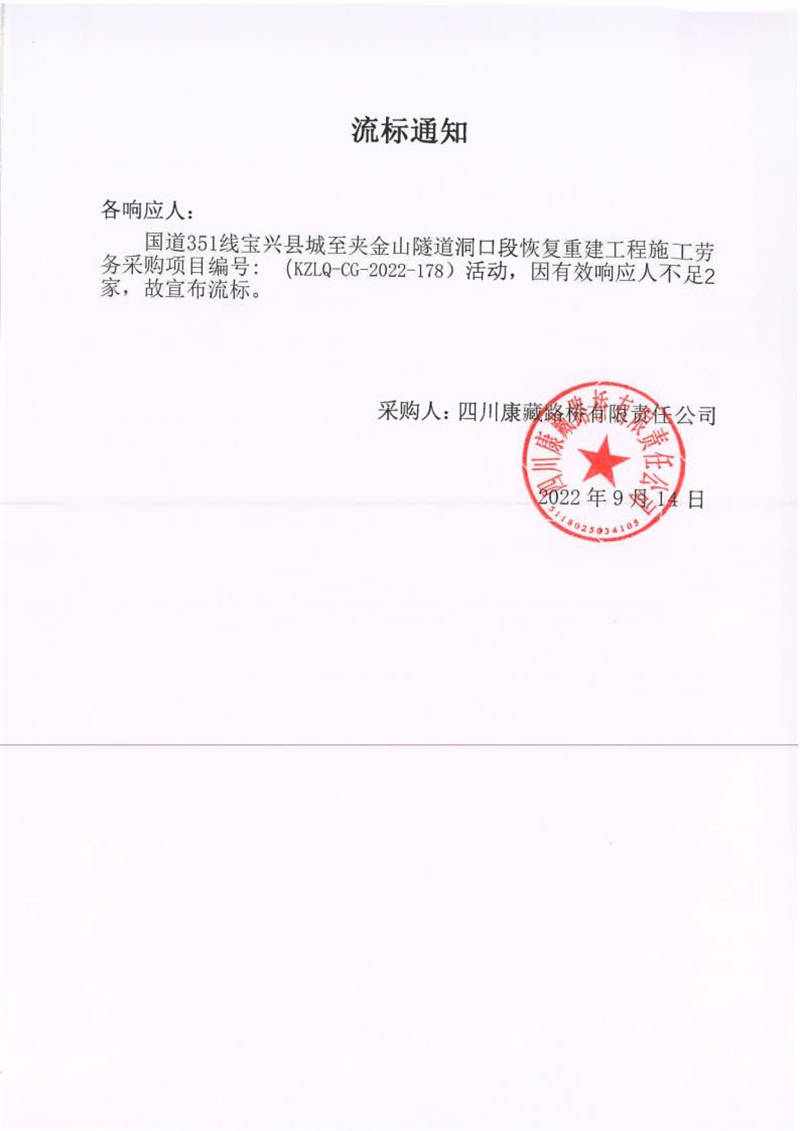 四川康藏路桥有限责任公司国道351线宝兴县城至夹金山隧道洞口段恢复重建工程施工劳务采购流标通知