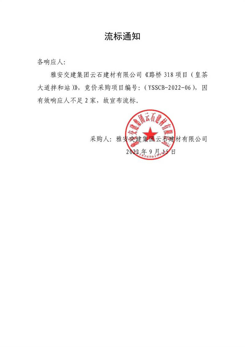 米兰体育-米兰(中国)官网 云石建材有限公司成品料运输服务采购(皇茶大道拌和站)流标通知