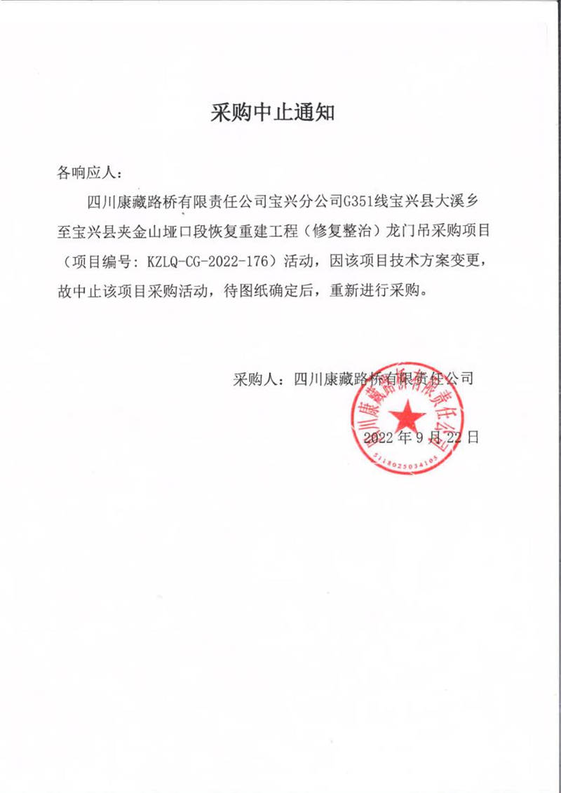 四川康藏路桥有限责任公司宝兴分公司G351线宝兴县大溪乡至宝兴县夹金山垭口段恢复重建工程(修复整治)龙门吊采购中止通知