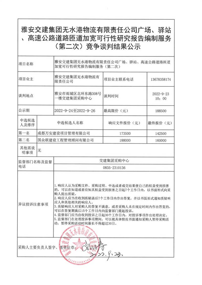 米兰体育-米兰(中国)官网 无水港物流有限责任公司广场、驿站、高速公路道路匝道加宽可行性研究报告编制服务(第二次)竞争谈判结果公示