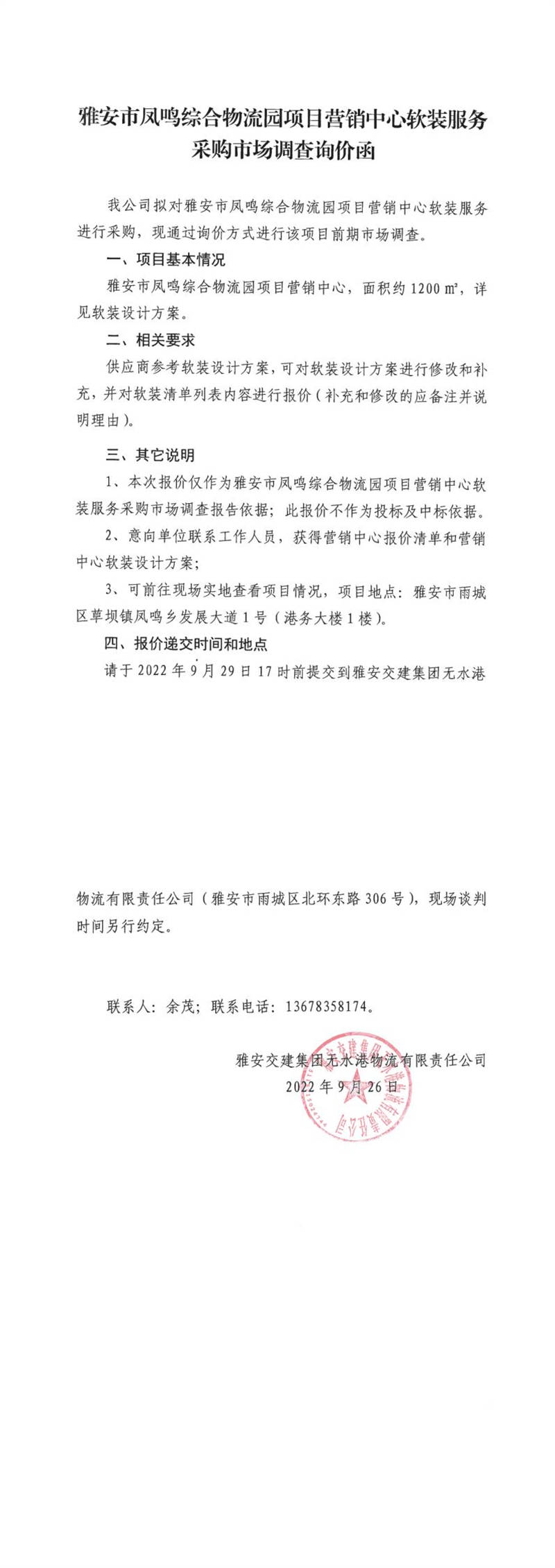 米兰体育-米兰(中国)官网 无水港物流有限责任公司雅安市凤鸣综合物流园项目营销中心软装服务采购市场调查询价函