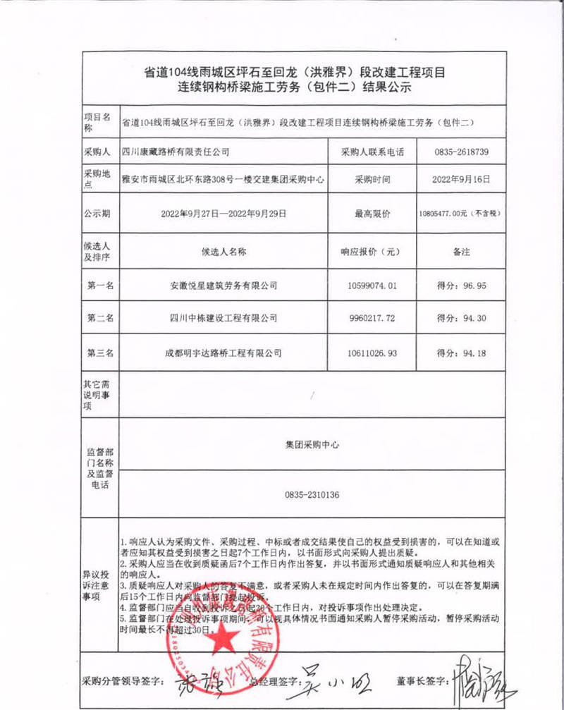 四川康藏路桥有限责任公司省道104线雨城区坪石至回龙(洪雅界)段改建工程项目连续钢构桥梁施工劳务(包件二)结果公示