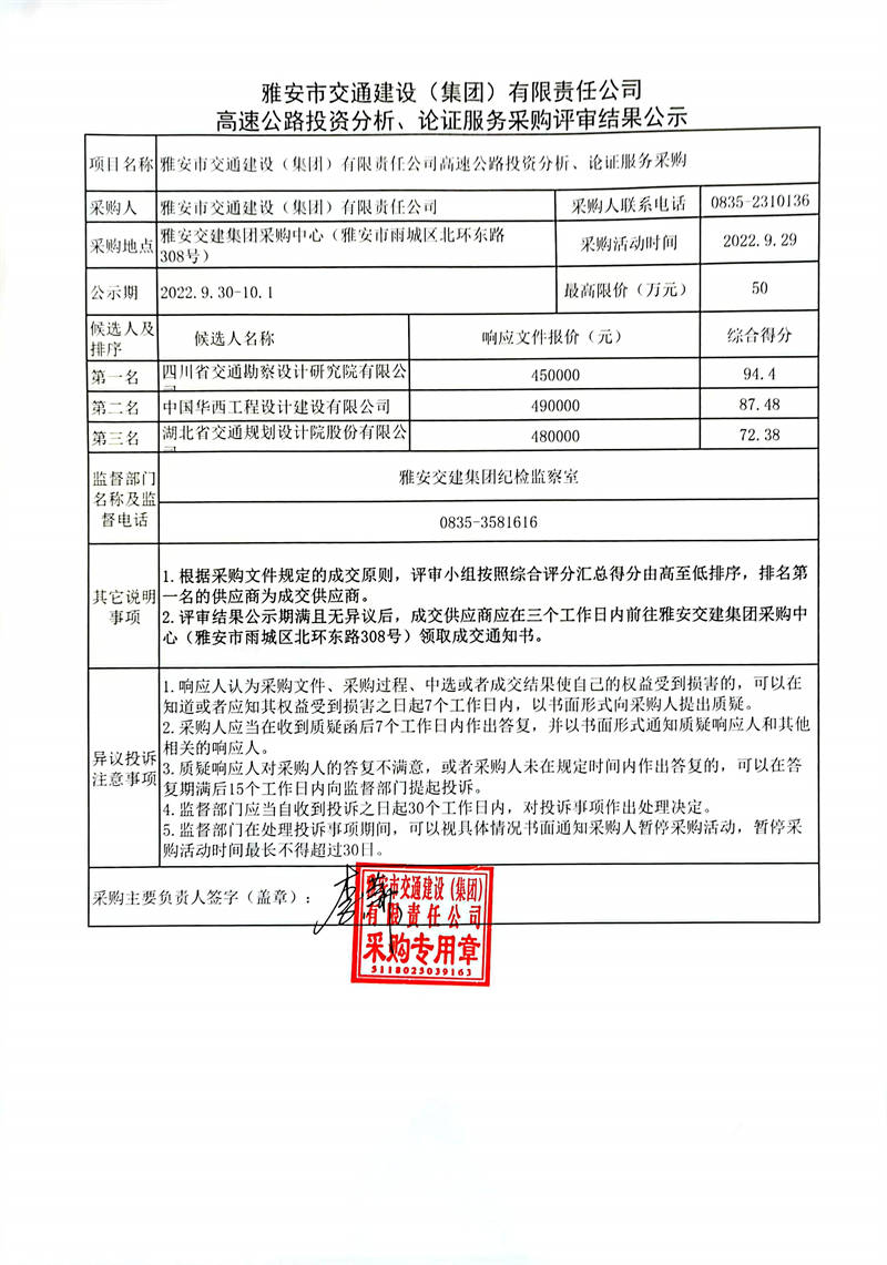 雅安市交通建设(集团)有限责任公司高速公路投资分析、论证服务采购评审结果公示