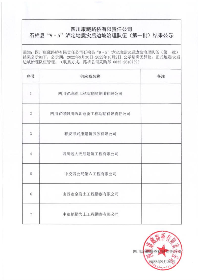 四川康藏路桥有限责任公司石棉县“9.5”泸定地震灾后边坡治理队伍(第一批)结果公示