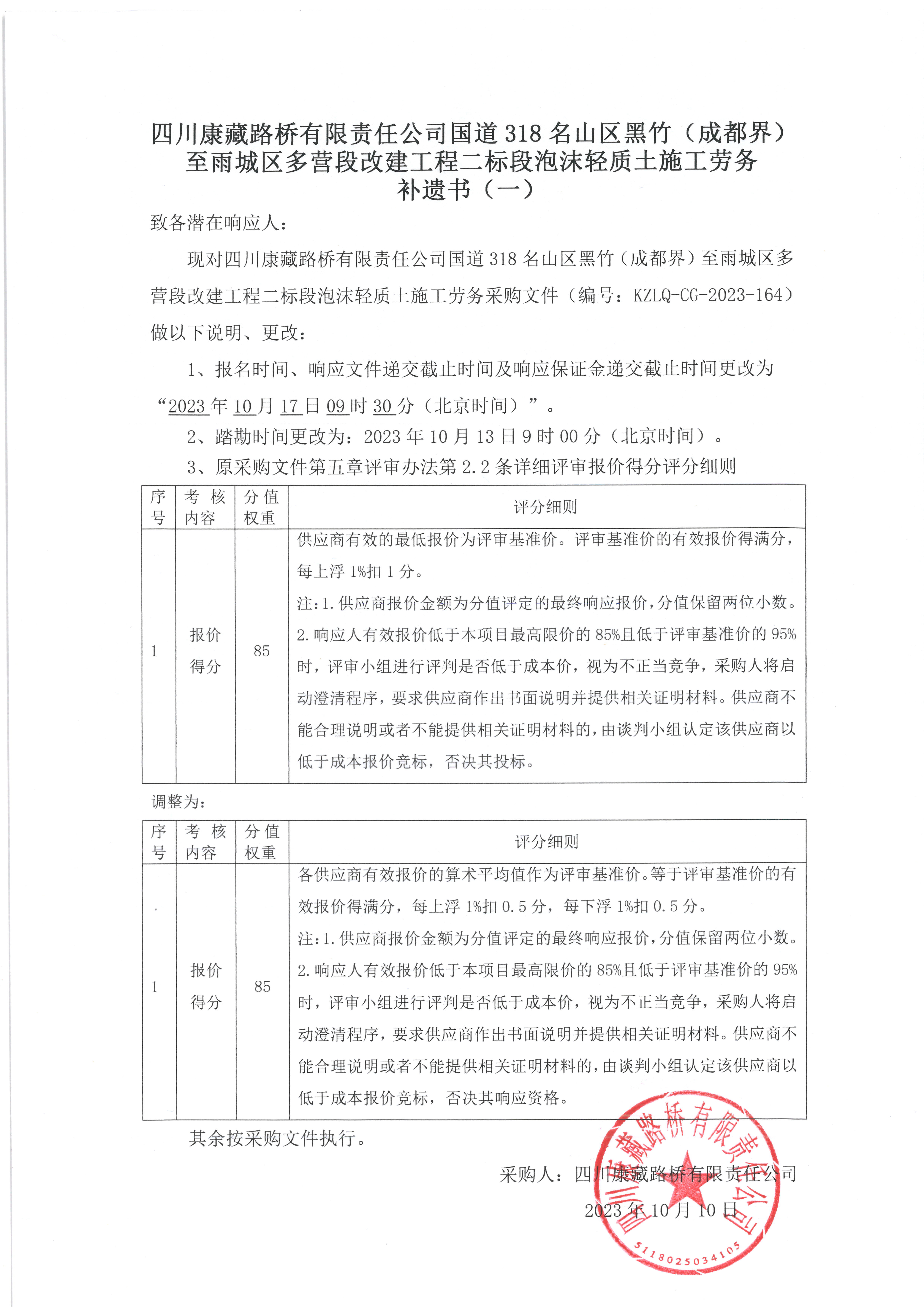 四川康藏路桥有限责任公司国道318名山区黑竹(成都界)至雨城区多营段改建工程二标段泡沫轻质土施工劳务补遗书(一)