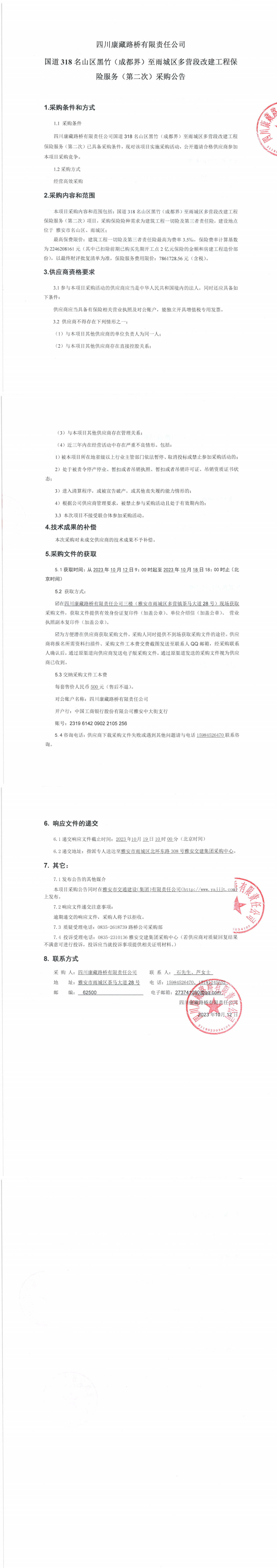 四川康藏路桥有限责任公司国道318名山区黑竹(成都界)至雨城区多营段改建工程保险服务(第二次)采购公告