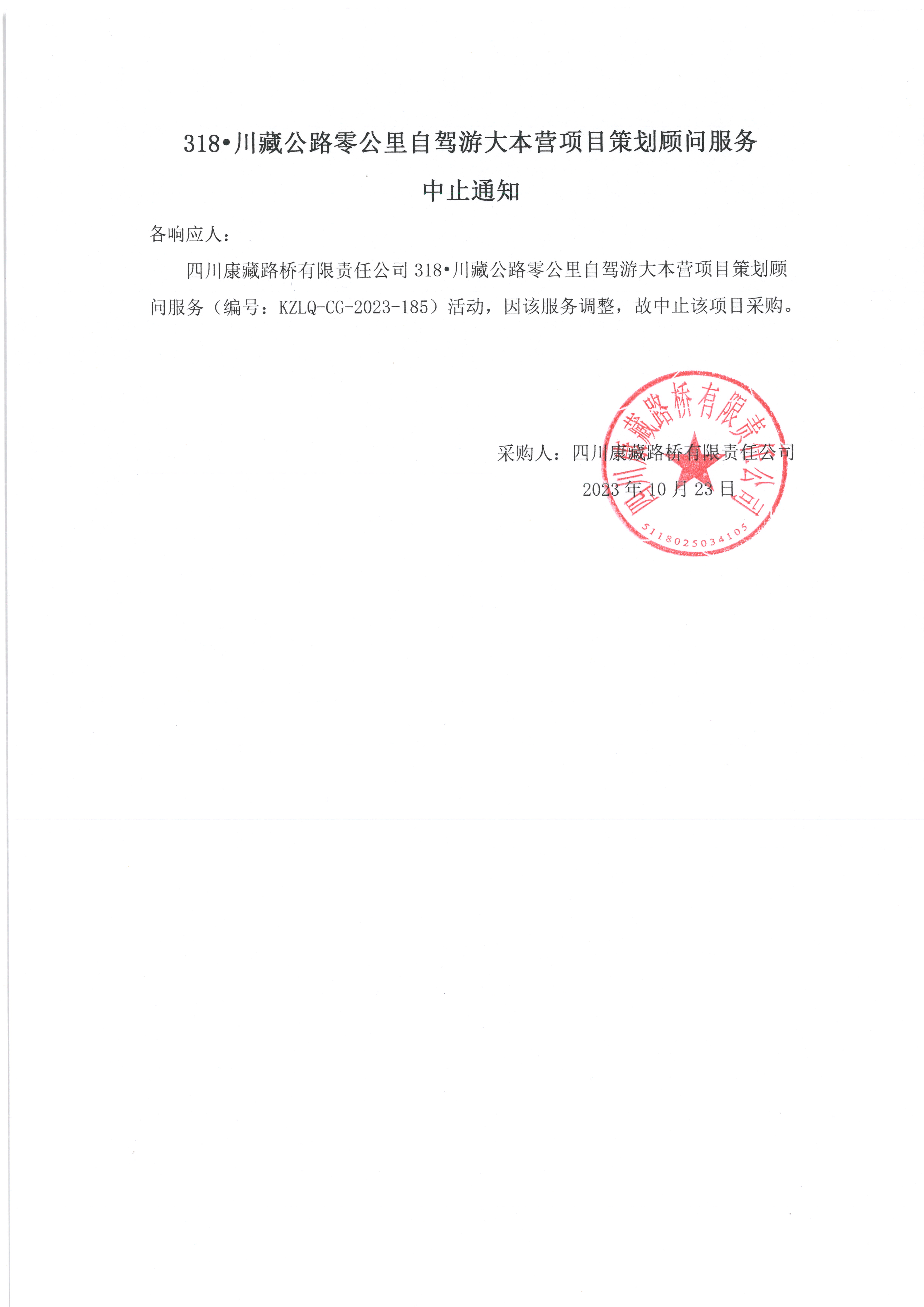四川康藏路桥有限责任公司318•川藏公路零公里自驾游大本营项目策划顾问服务中止通知