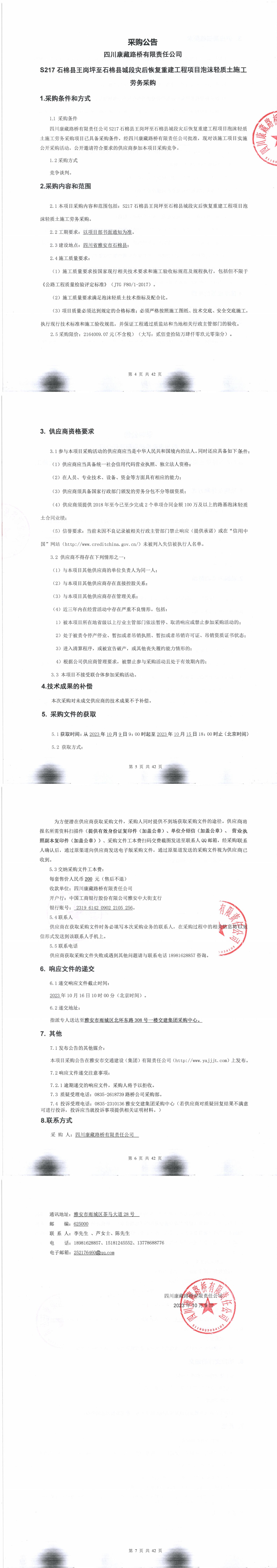 四川康藏路桥有限责任公司S217石棉县王岗坪至石棉县城段灾后恢复重建工程项目泡沫轻质土施工劳务采购公告