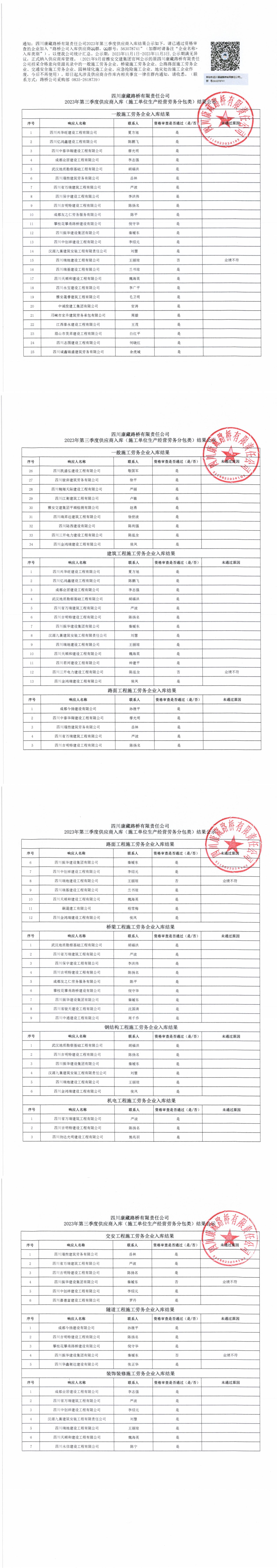 四川康藏路桥有限责任公司2023年第三季度供应商入库(施工单位生产经营劳务分包类)结果公示
