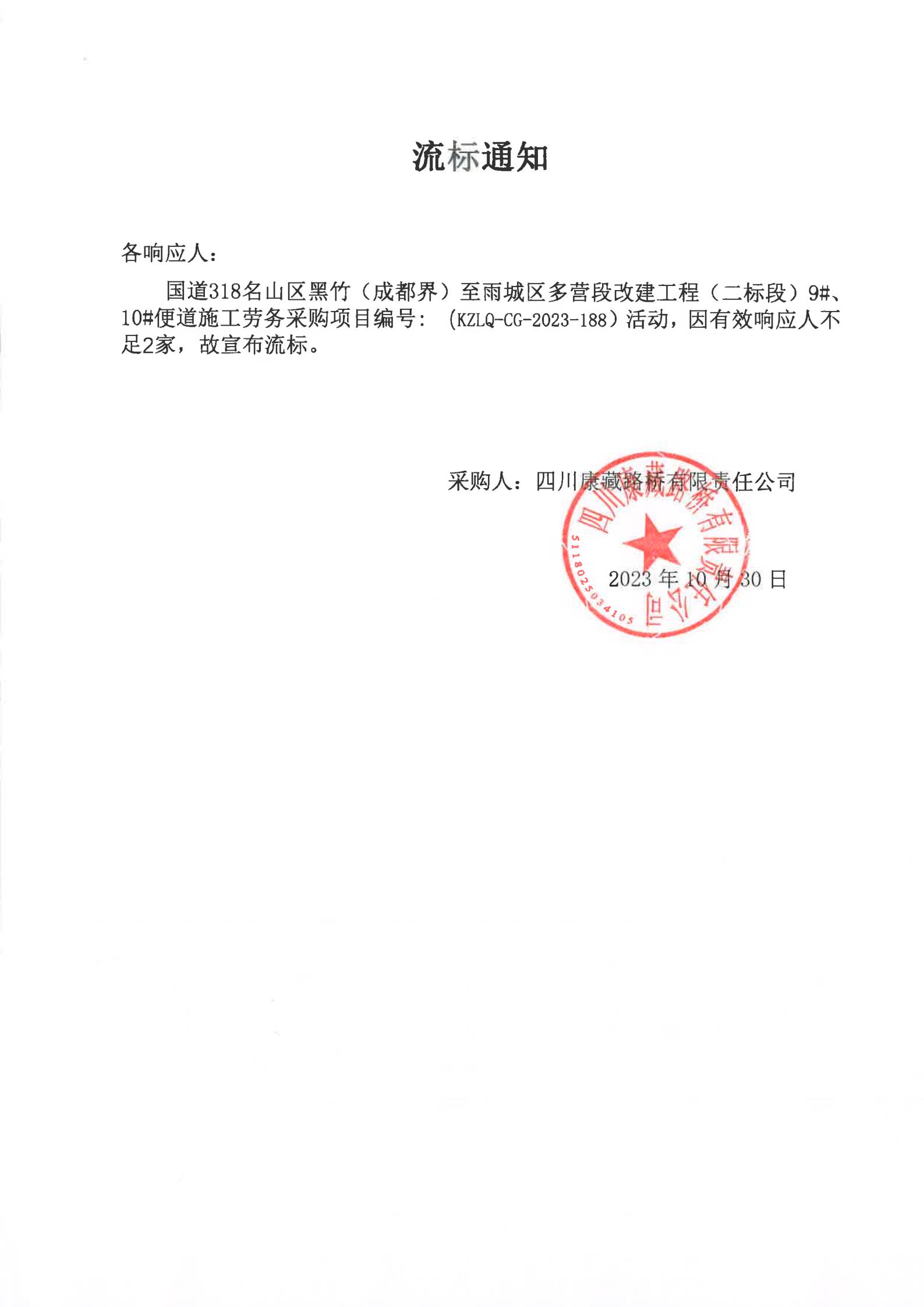 四川康藏路桥有限责任公司国道318名山区黑竹(成都界)至雨城区多营段改建工程(二标段)9#、10#便道施工劳务采购流标通知