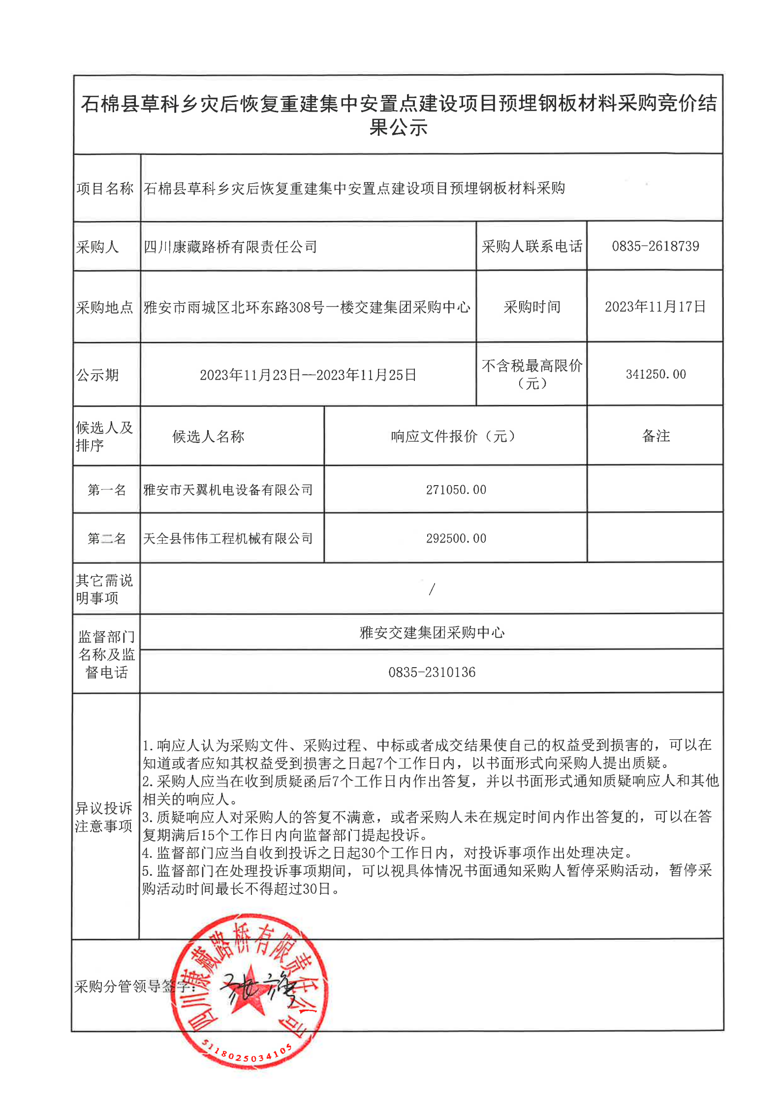 四川康藏路桥有限责任公司石棉县草科乡灾后恢复重建集中安置点建设项目预埋钢板材料采购结果公示