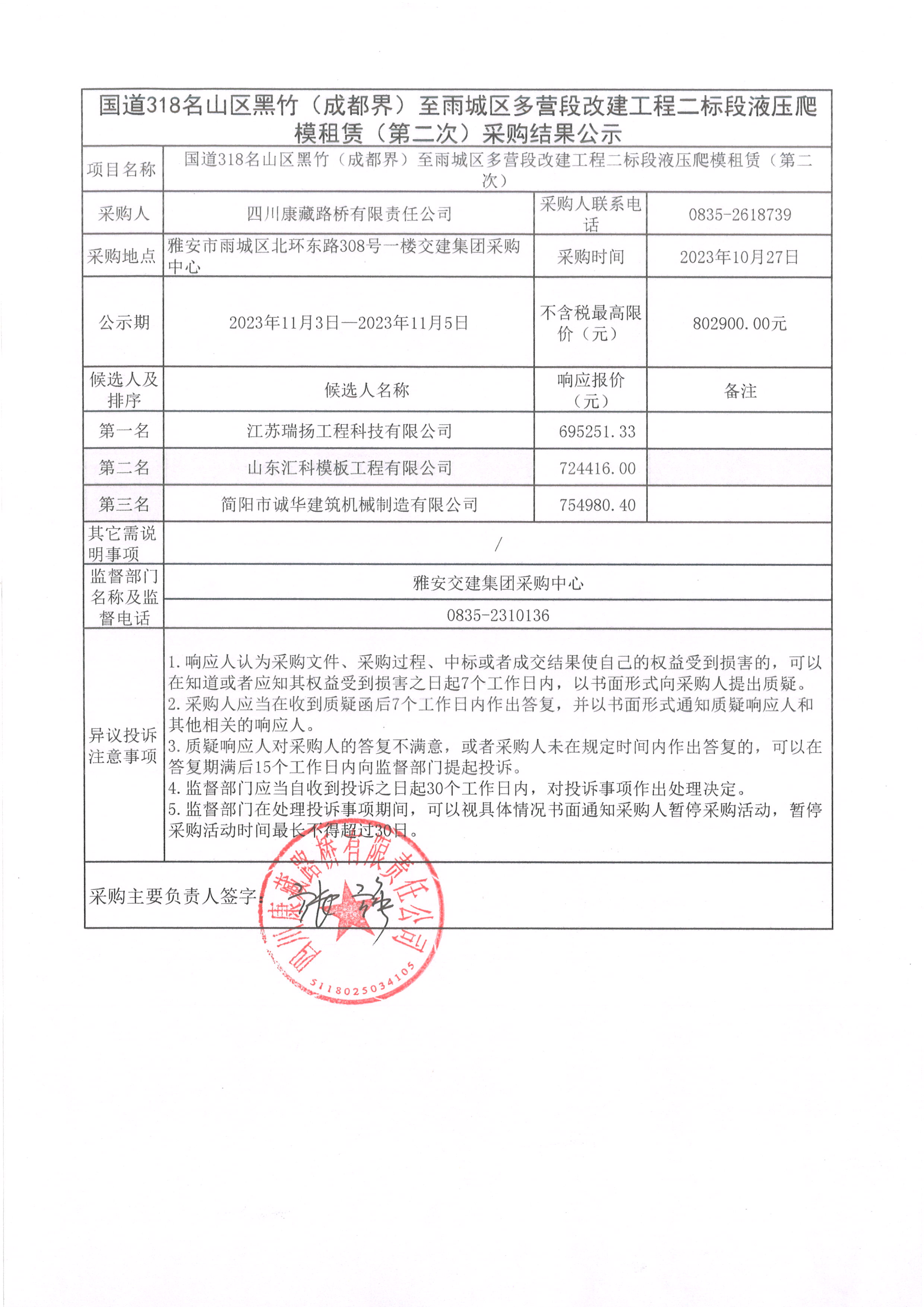 四川康藏路桥有限责任公司国道318名山区黑竹(成都界)至雨城区多营段改建工程二标段液压爬模租赁(第二次)采购结果公示