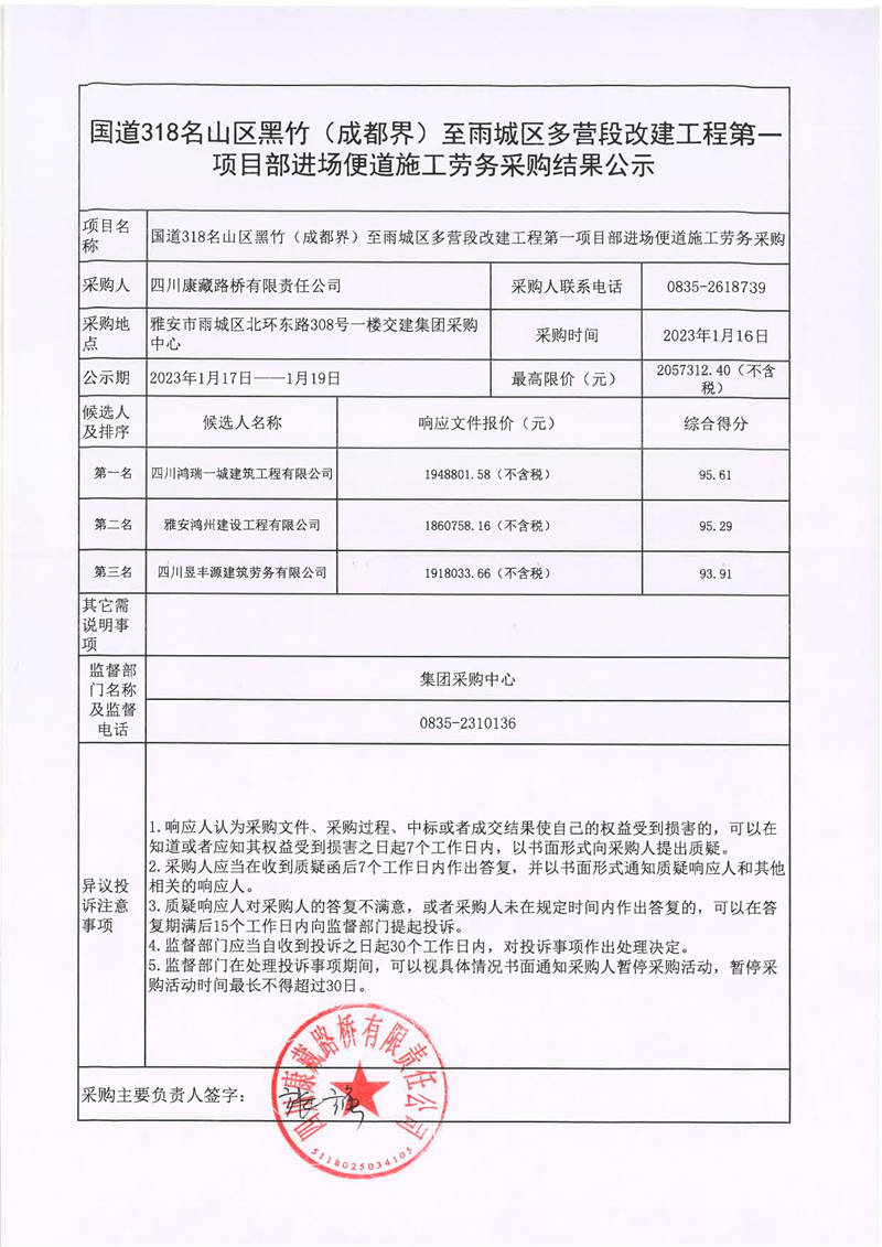 四川康藏路桥有限责任公司国道318名山区黑竹(成都界)至雨城区多营段改建工程第一项目部进场便道施工劳务采购结果公示