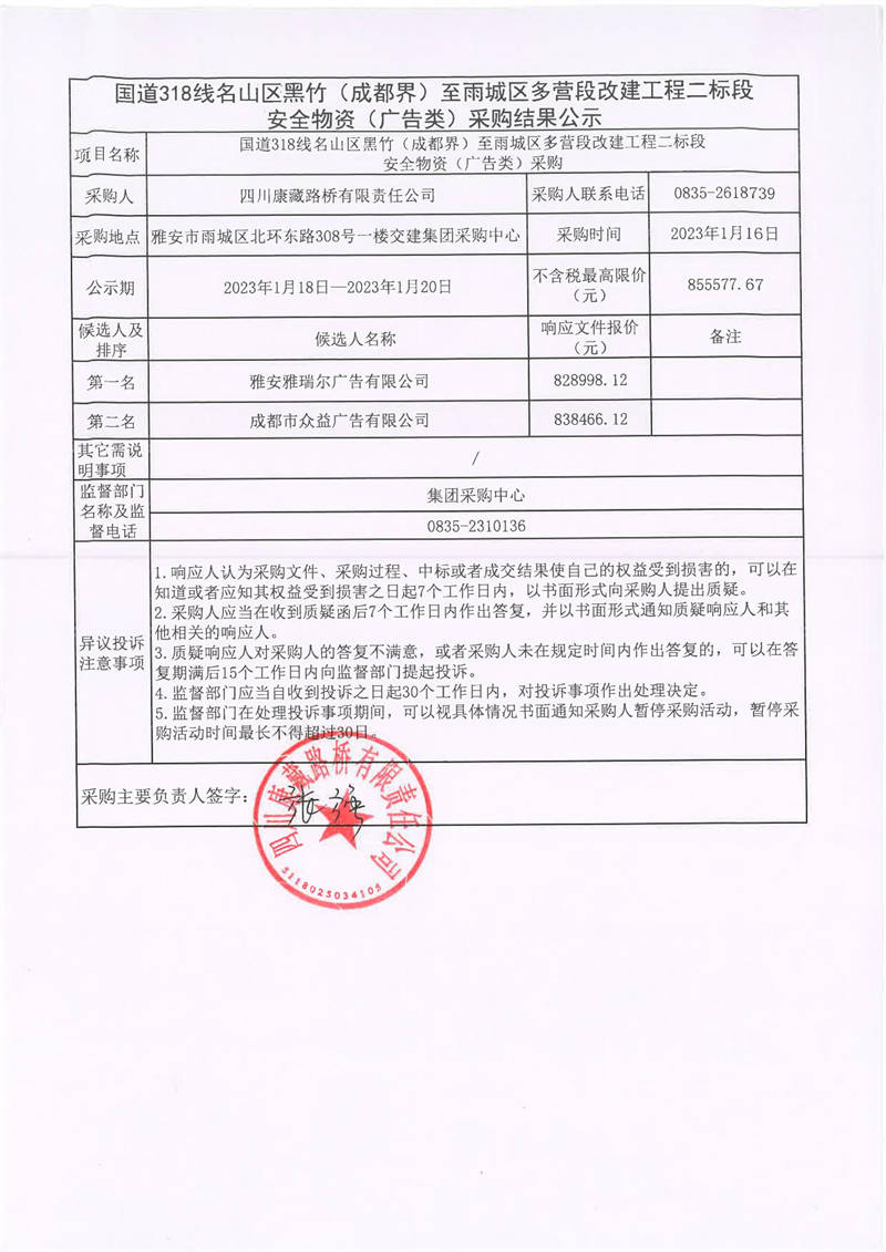 四川康藏路桥有限责任公司国道318线名山区黑竹(成都界)至雨城区多营段改建工程二标段安全物资(广告类)采购结果公示