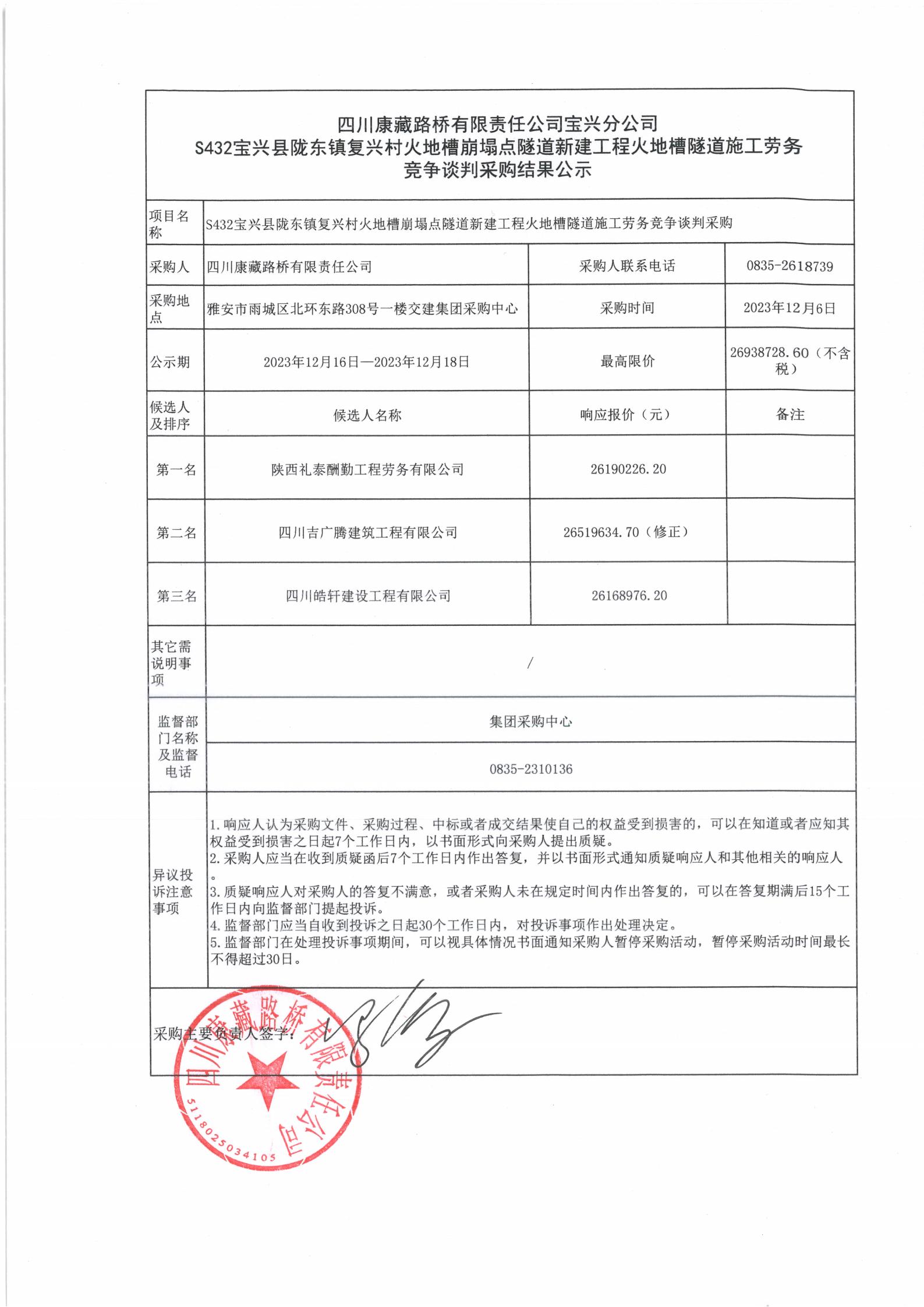 四川康藏路桥有限责任公司宝兴分公司S432宝兴县陇东镇复兴村火地槽崩塌点隧道新建工程火地槽隧道施工劳务竞争谈判采购结果公示