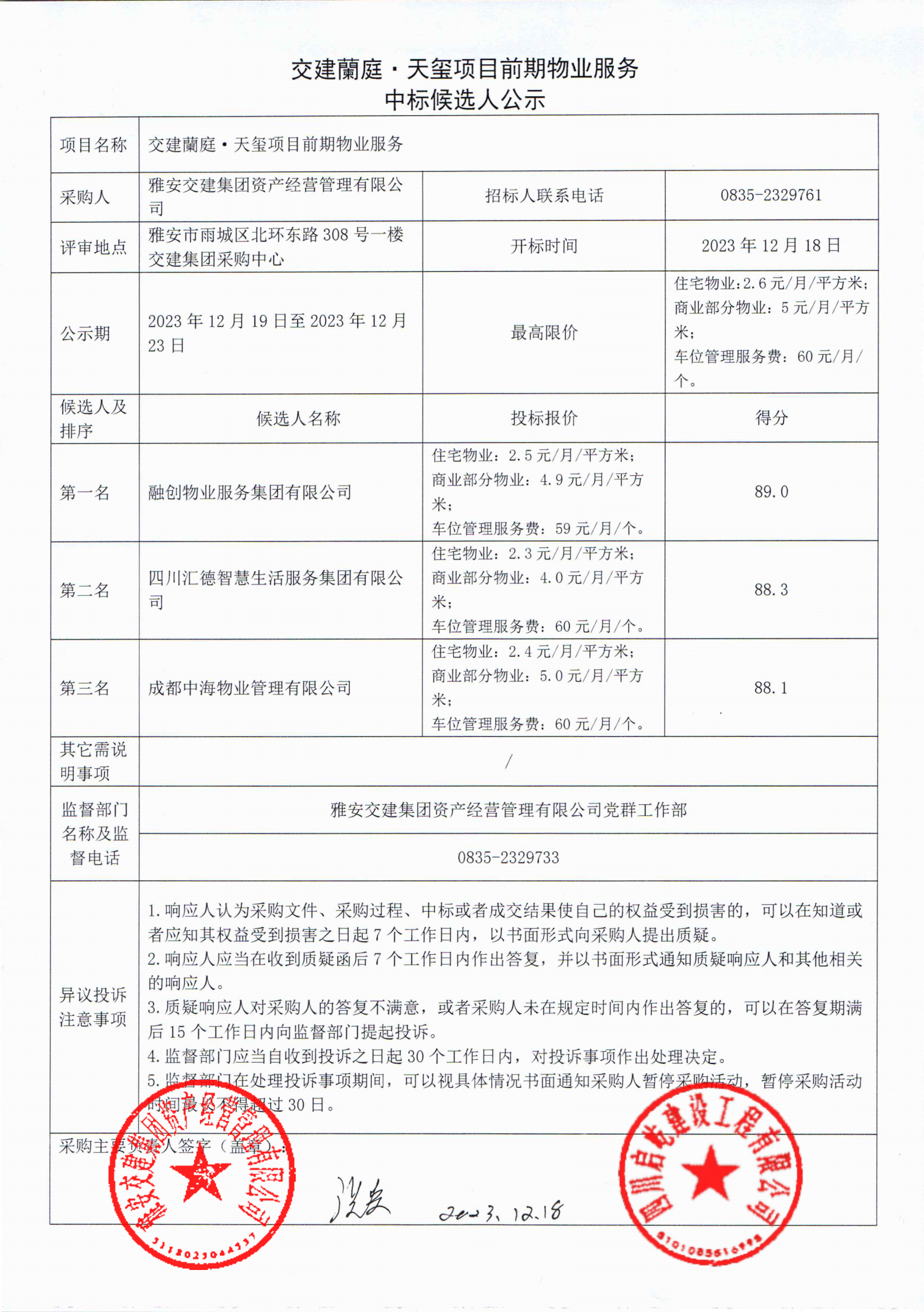 米兰体育-米兰(中国)官网 资产经营管理有限公司交建蘭庭·天玺项目前期物业服务中标候选人公示