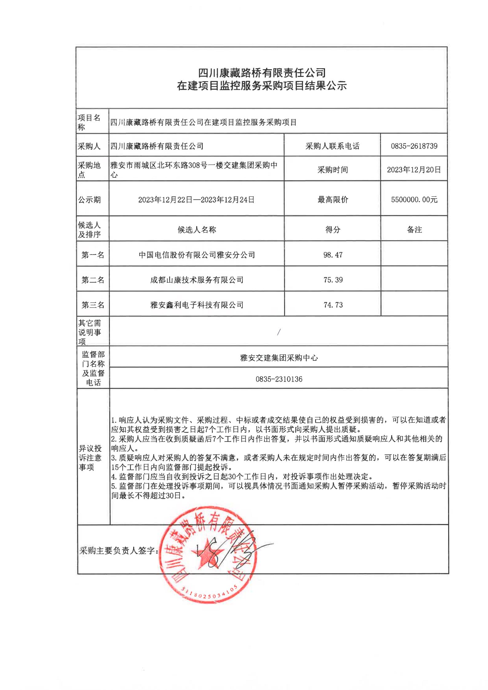 四川康藏路桥有限责任公司在建项目监控服务采购项目结果公示