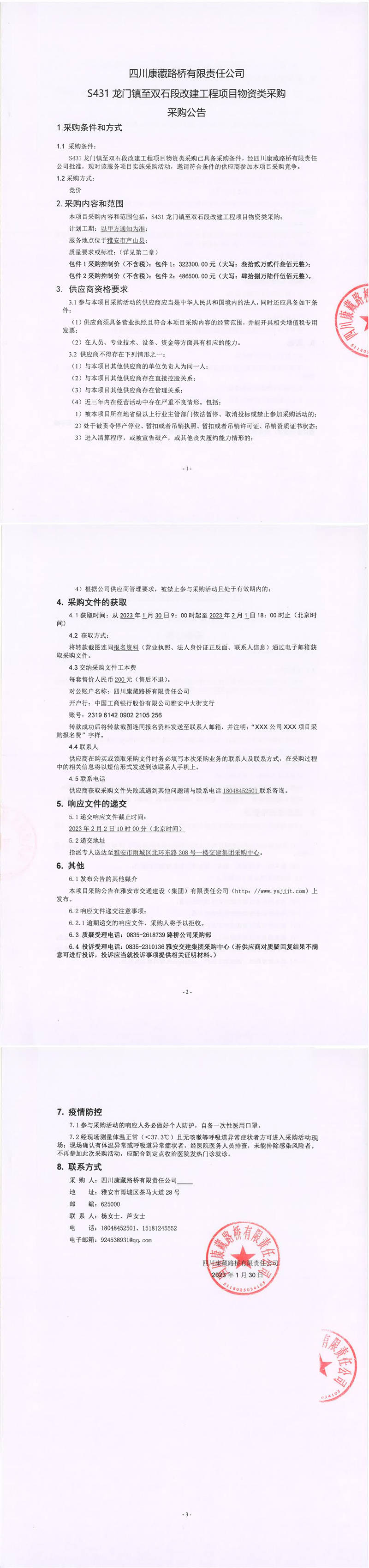 四川康藏路桥有限责任公司S431龙门镇至双石段改建工程项目物资类采购采购公告