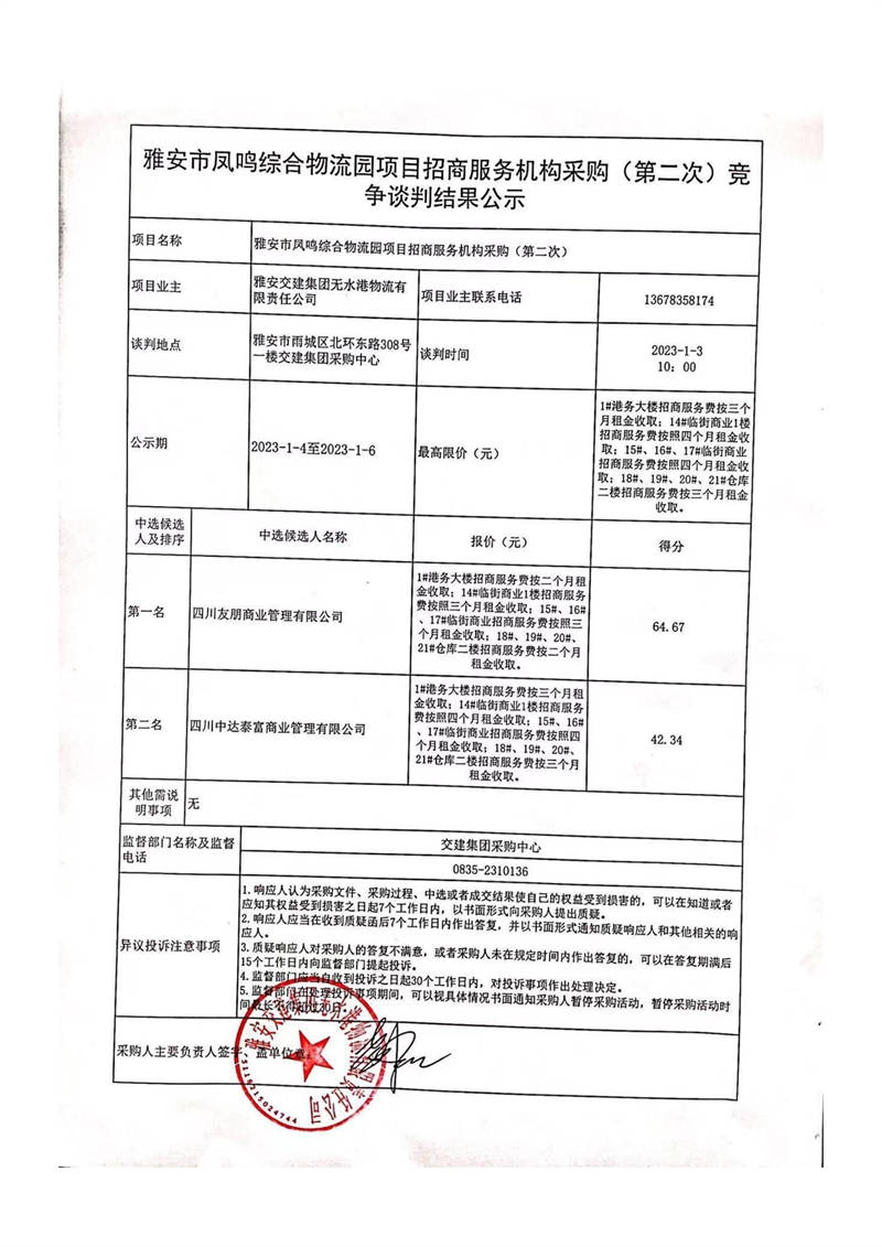 米兰体育-米兰(中国)官网 无水港物流有限责任公司雅安市凤鸣综合物流园项目招商服务机构采购(第二次)竞争谈判结果公示