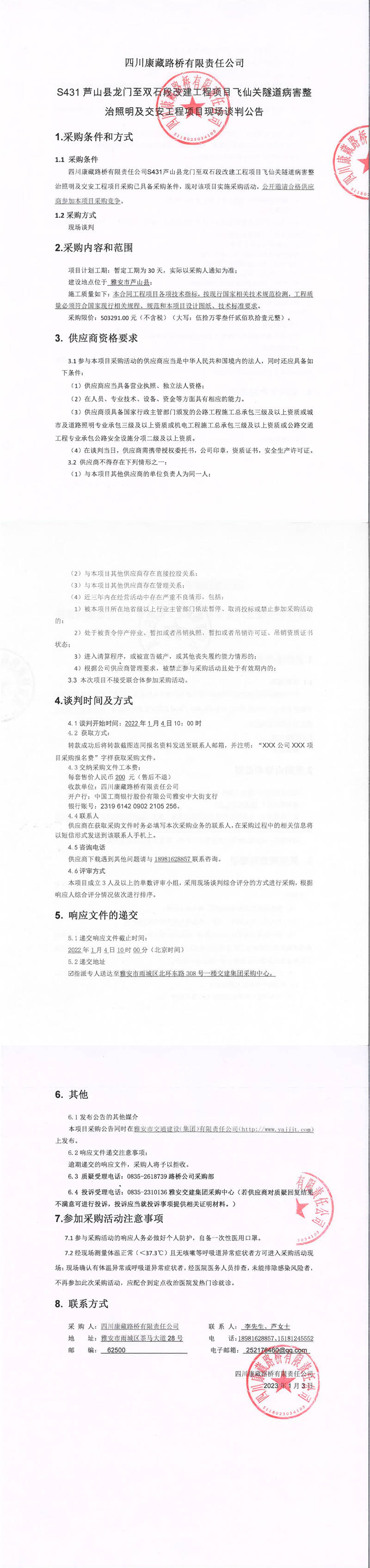 四川康藏路桥有限责任公司S431芦山县龙门至双石段改建工程项目飞仙关隧道病害整治照明及交安工程项目现场谈判公告