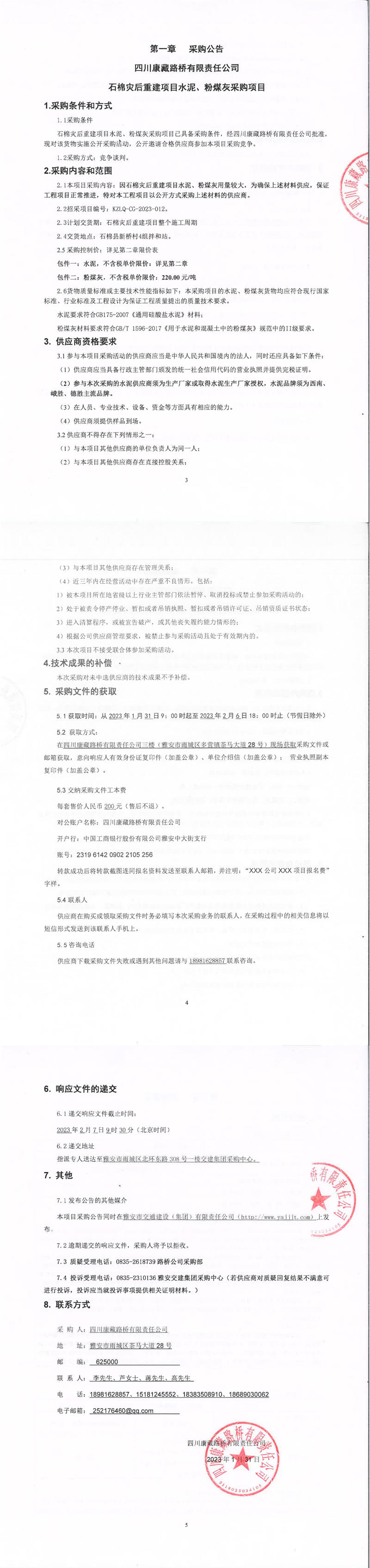 四川康藏路桥有限责任公司石棉灾后重建项目水泥、粉煤灰采购项目采购公告