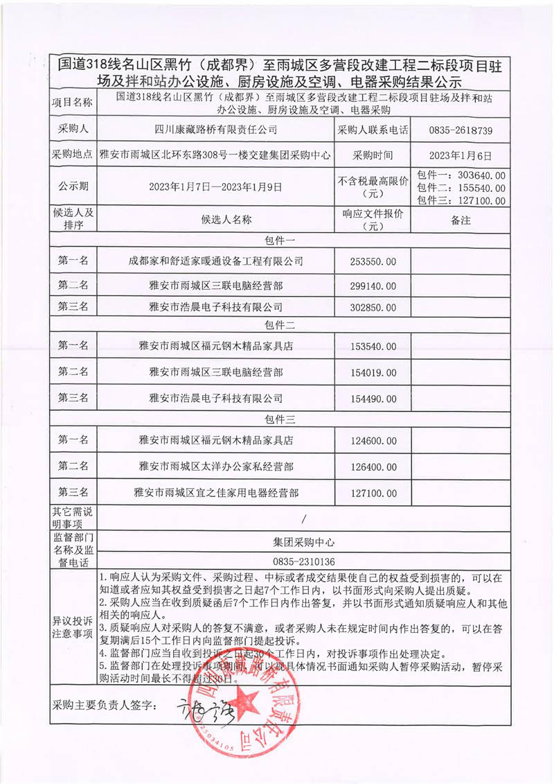 四川康藏路桥有限责任公司国道318线名山区黑竹(成都界)至雨城区多营段改建工程二标段项目驻场及拌和站办公设施、厨房设施及空调、电器采购结果公示
