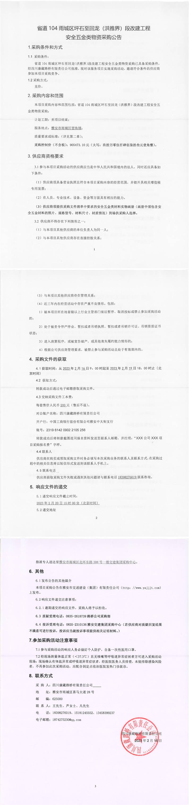 四川康藏路桥有限责任公司省道104雨城区坪石至回龙(洪雅界)段改建工程安全五金类物资采购公告