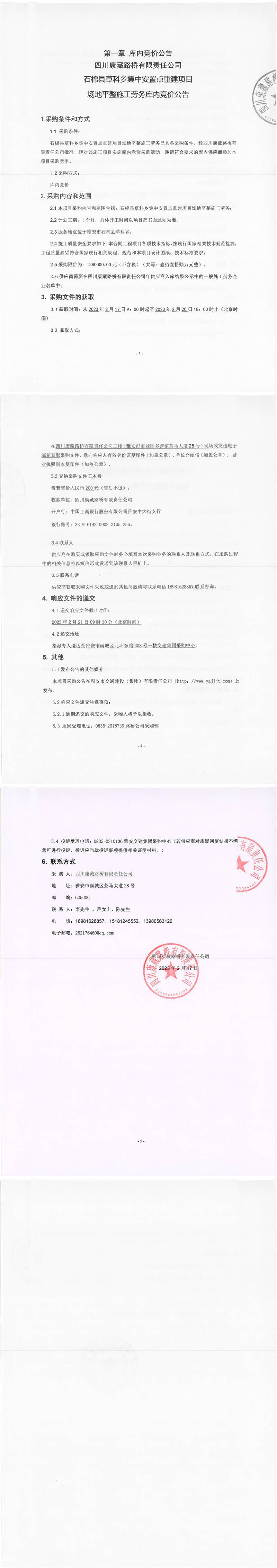 四川康藏路桥有限责任公司石棉草科乡集中安置点重建项目场地平整施工劳务库内竞价公告