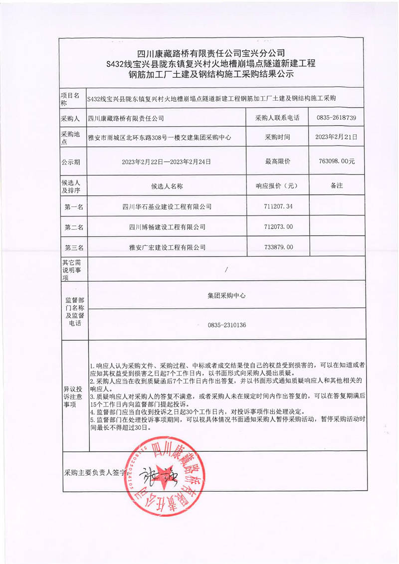 四川康藏路桥有限责任公司宝兴分公司S432宝兴县陇东镇复兴村火地槽崩塌点隧道新建工程钢筋加工厂土建及钢结构施工采购结果公示