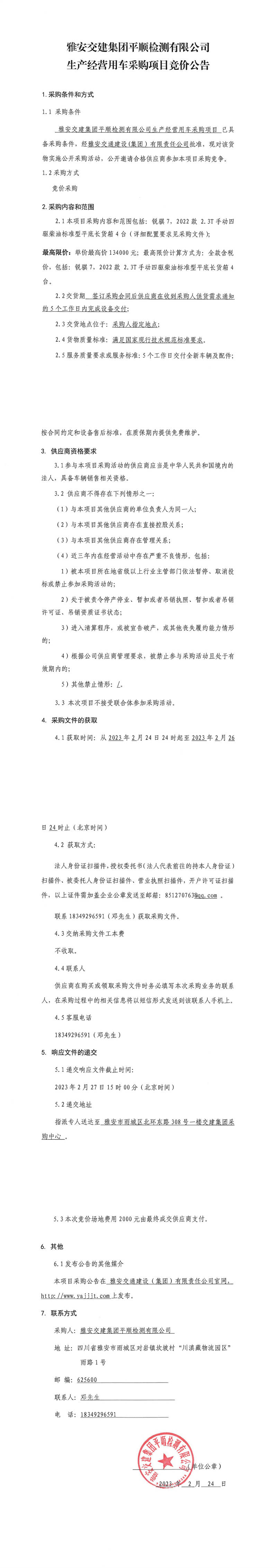 米兰体育-米兰(中国)官网 平顺检测有限公司生产经营用车采购项目竞价公告