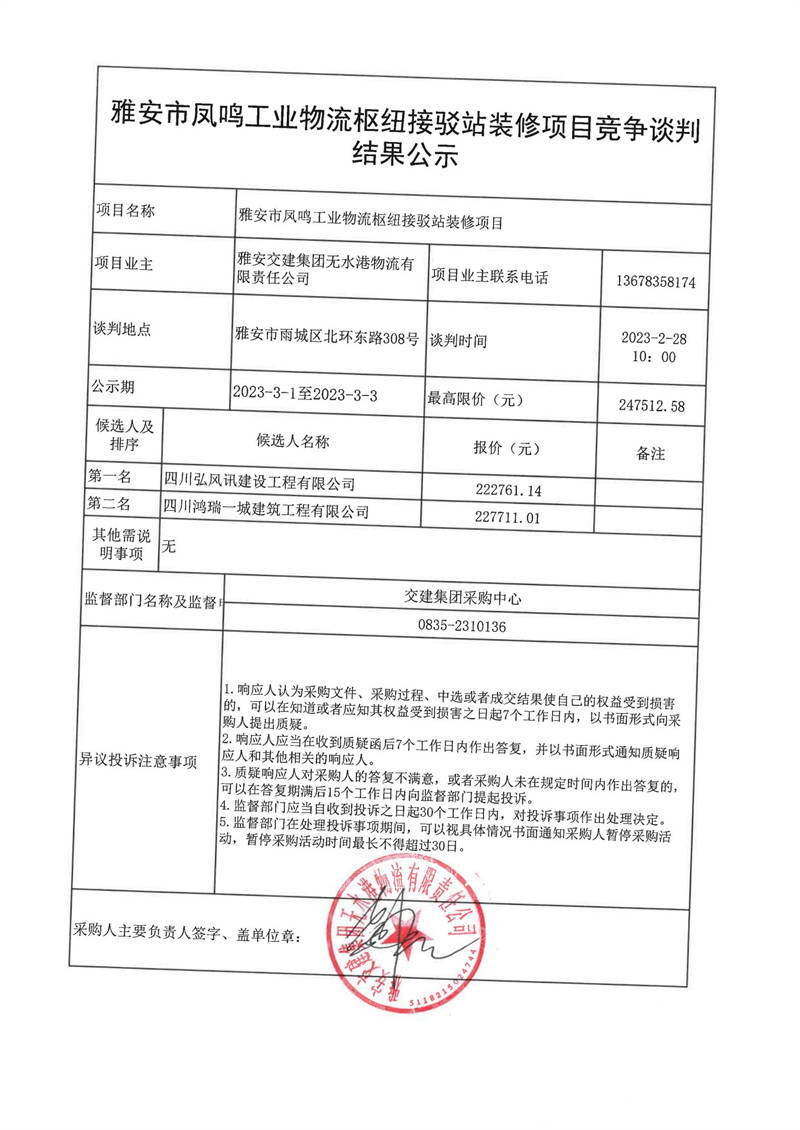 米兰体育-米兰(中国)官网 无水港物流有限责任公司雅安市凤鸣工业物流枢纽接驳站装修项目竞争谈判结果公示