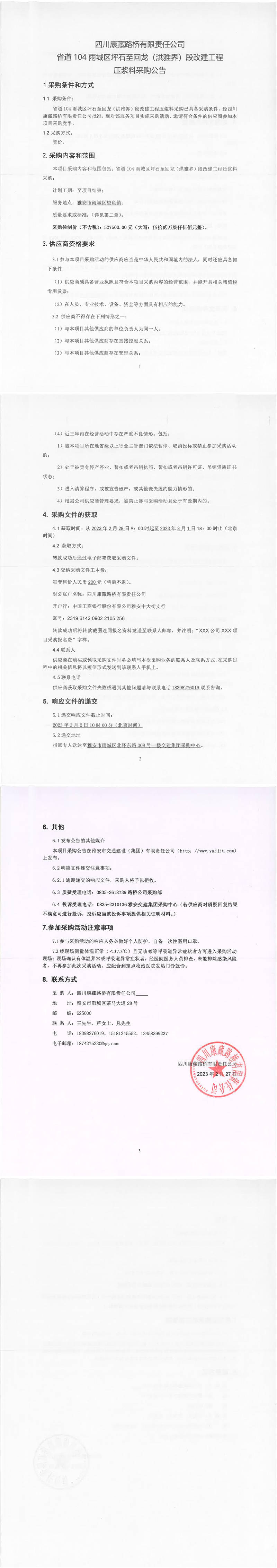 四川康藏路桥有限责任公司省道104雨城区坪石至回龙(洪雅界)段改建工程压浆料采购公告