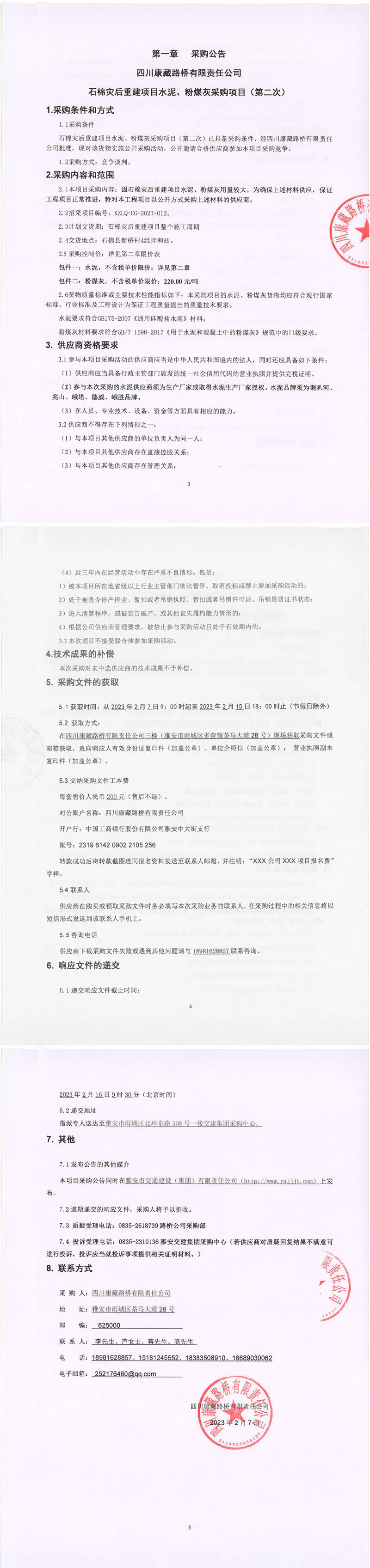 四川康藏路桥有限责任公司石棉灾重建项目水泥、粉煤灰采购项目(第二次)采购公告