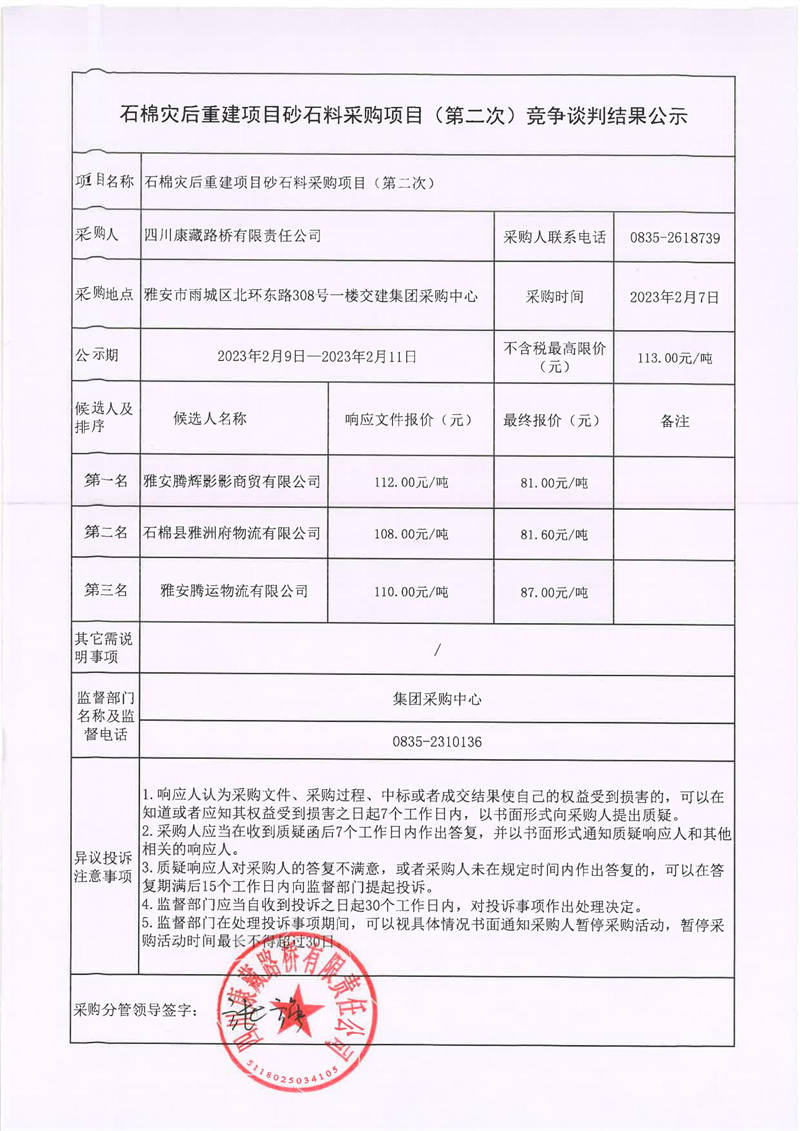 四川康藏路桥有限责任公司石棉灾后重建项目砂石料采购项目(第二次)竞争谈判结果公示