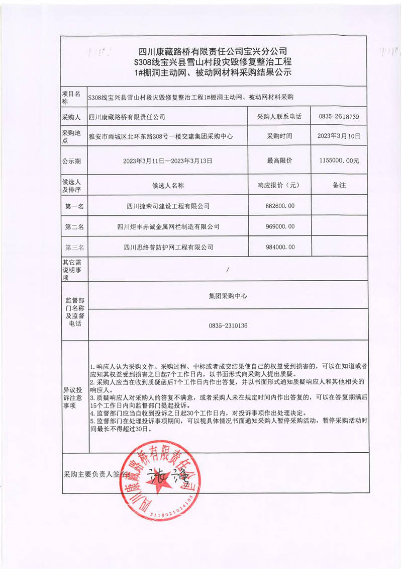 四川康藏路桥有限责任公司宝兴分公司S308线宝兴县雪山村段灾毁修复整治工程1#棚洞主动网、被动网材料采购结果公示