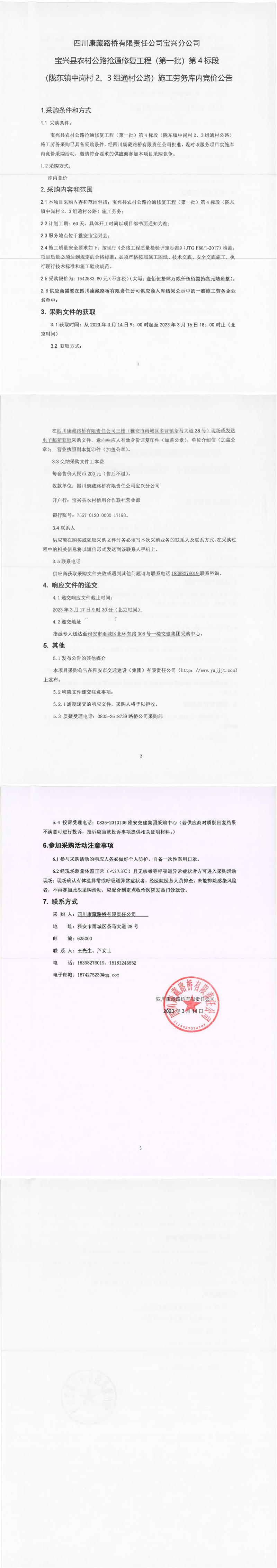 四川康藏路桥有限责任公司宝兴分公司宝兴县农村公路抢通修复工程(第一批)第4标段(陇东镇中岗村2、3组通村公路)施工劳务库内竞价公告