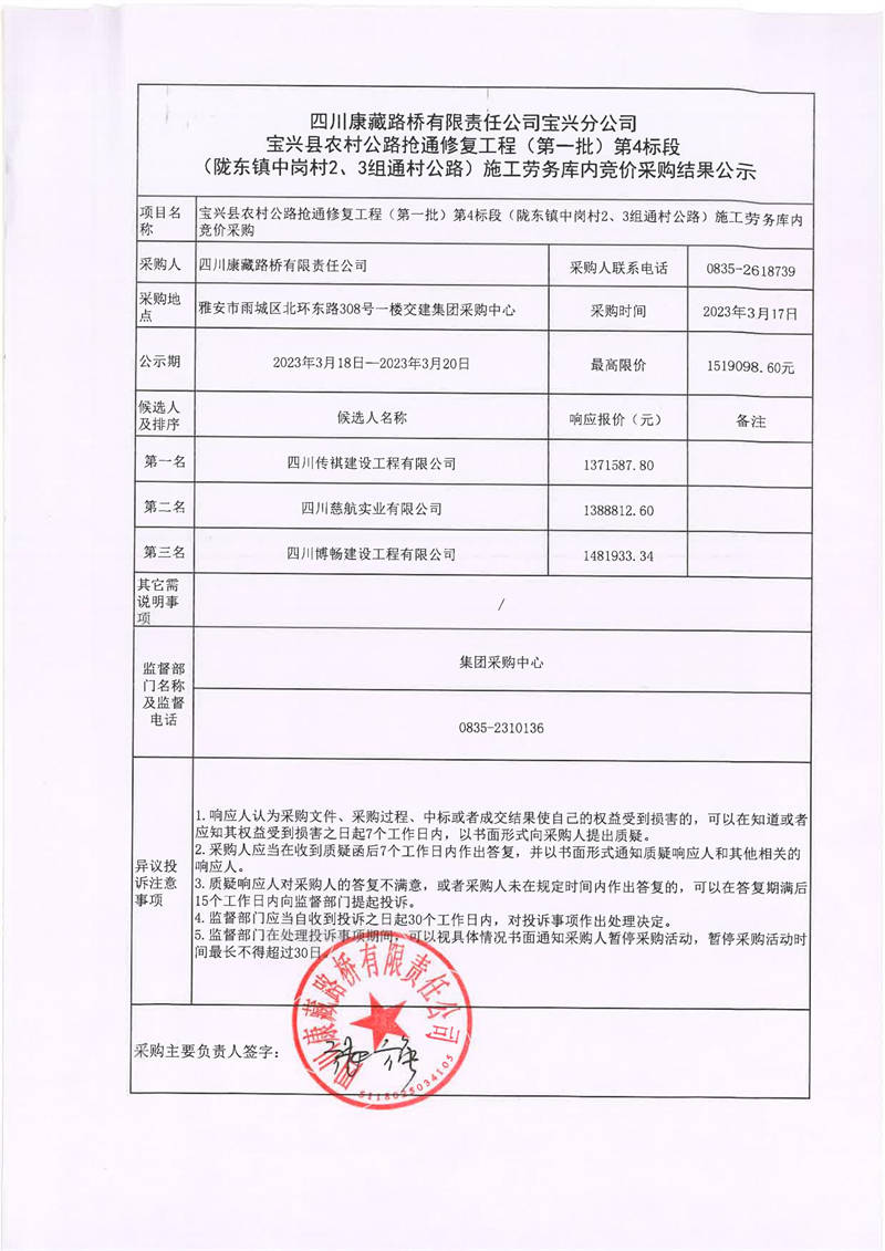 四川康藏路桥有限责任公司宝兴分公司宝兴县农村公路抢通修复工程(第一批)第4标段(陇东镇中岗村2、3组通村公路)施工劳务库内竞价采购结果公示