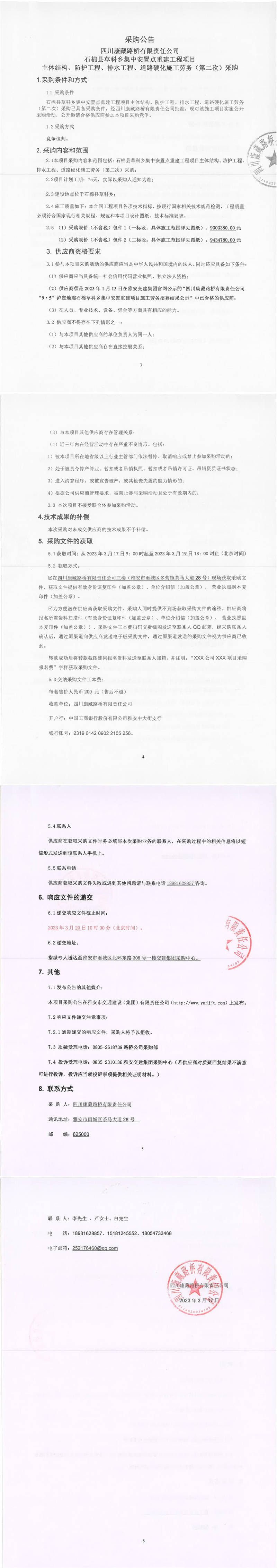 四川康藏路桥有限责任公司石棉草科乡集中安置点重建工程项目主体结构、防护工程、排水工程、道路硬化施工劳务(第二次)采购公告