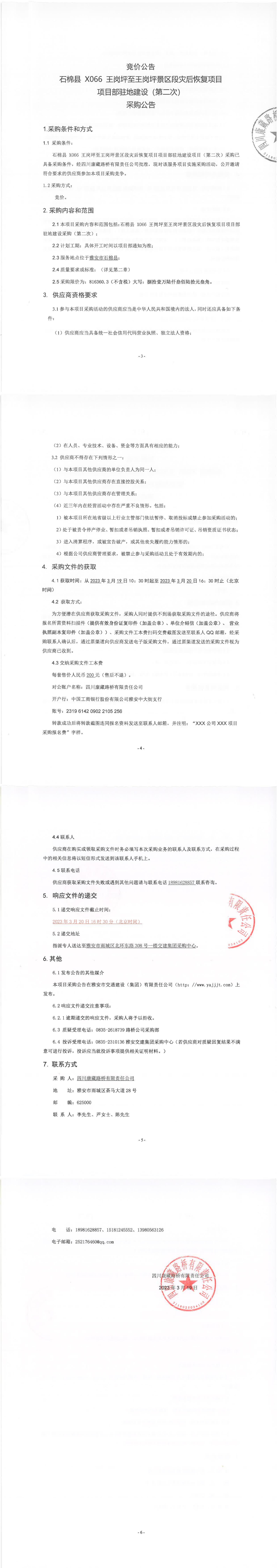 四川康藏路桥有限责任公司石棉县X066王岗坪至王岗坪景区段灾后恢复项目项目部驻地建设(第二次)采购公告