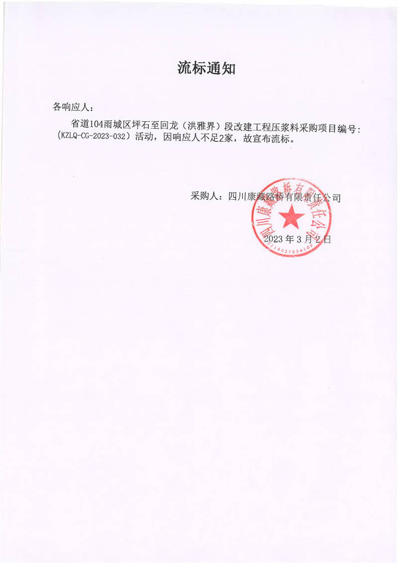 四川康藏路桥有限责任公司省道104雨城区坪石至回龙(洪雅界)段改建工程压浆料采购流标通知