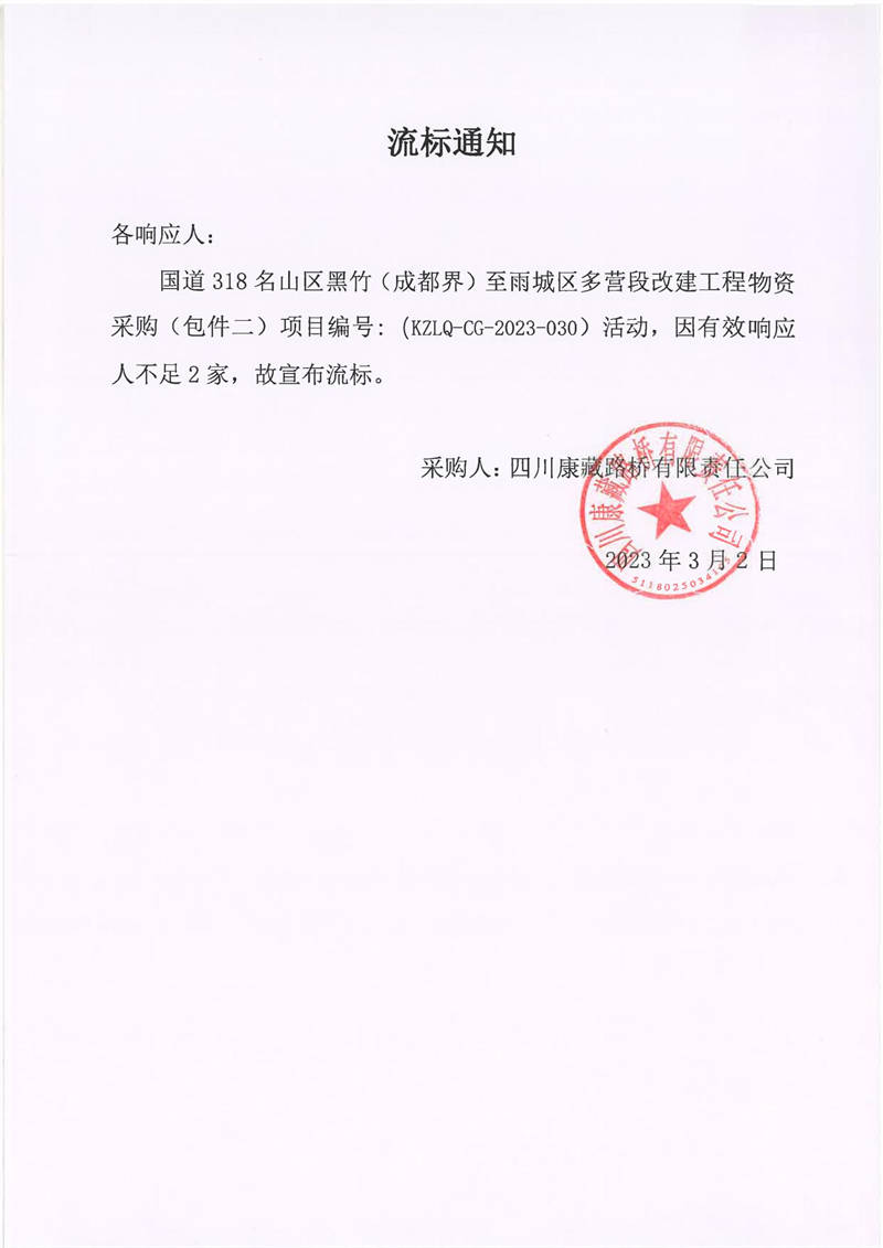 四川康藏路桥有限责任公司国道318名山区黑竹(成都界)至雨城区多营段改建工程物资采购包件2流标通知