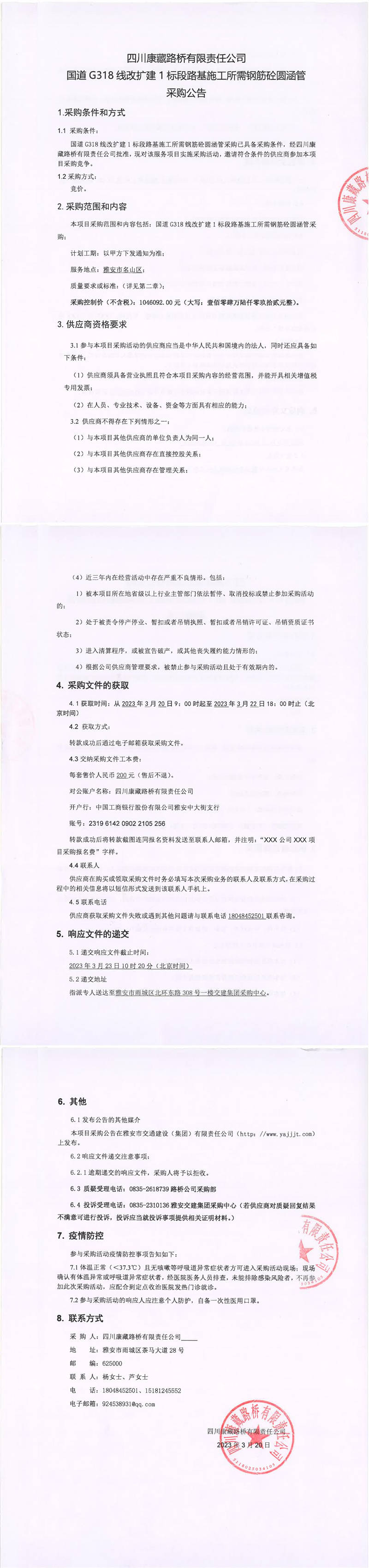 四川康藏路桥有限责任公司国道G318线改扩建1标段路基施工所需钢筋砼圆涵管采购公告