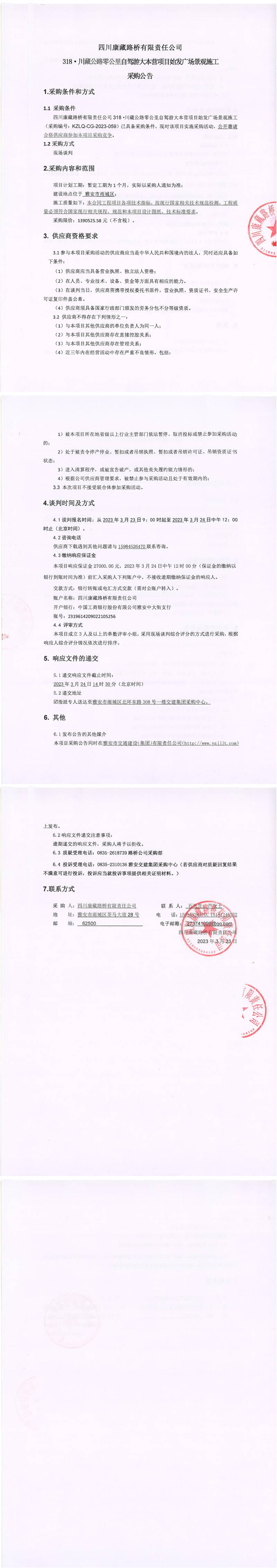 四川康藏路桥有限责任公司318·川藏公路零公里自驾游大本营项目始发广场景观施工采购公告