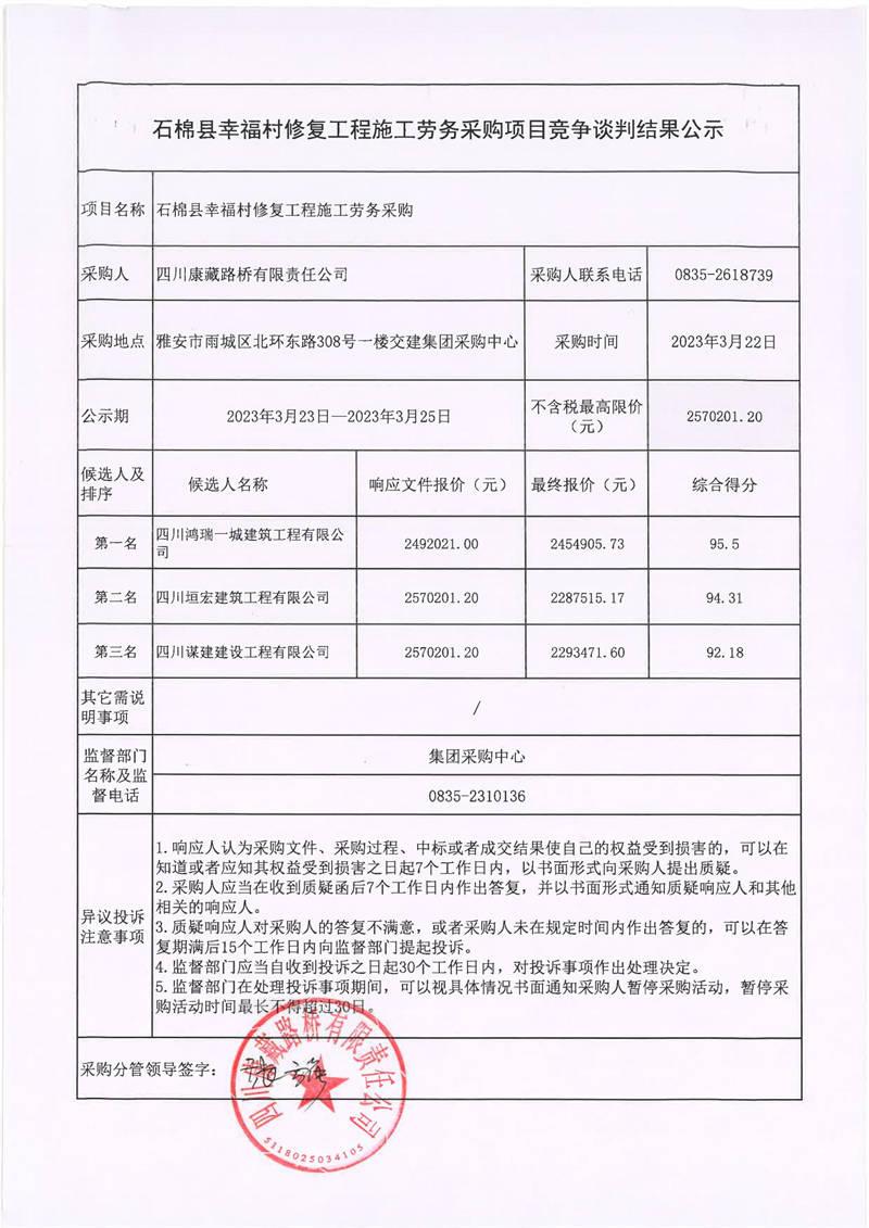 四川康藏路桥有限责任公司石棉县幸福村修复工程施工劳务采购项目竞争谈判结果公示