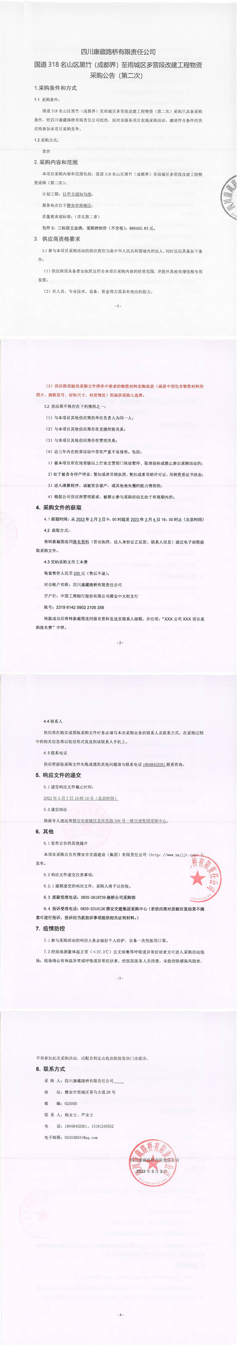 四川康藏路桥有限责任公司国道318名山区黑竹(成都界)至雨城区多营段改建工程物资采购公告(第二次)