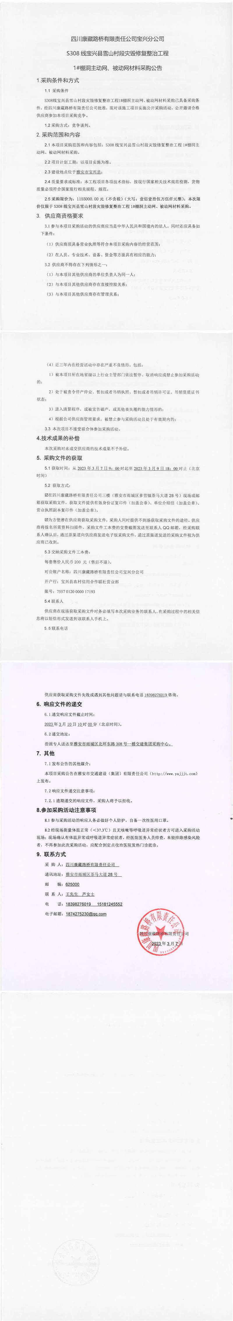 四川康藏路桥有限责任公司宝兴分公司S308线宝兴县雪山村段灾毁修复整治工程1#棚洞主动网、被动网材料采购公告