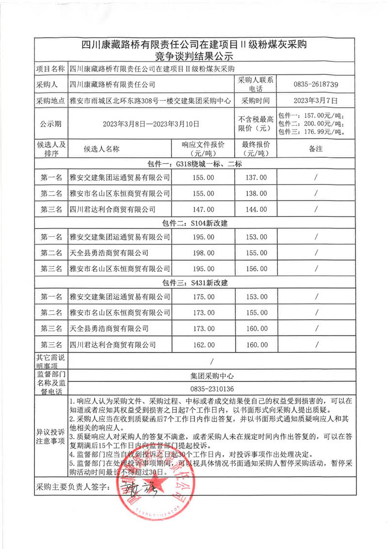 四川康藏路桥有限责任公司在建项目II级粉煤灰采购竞争谈判结果公示