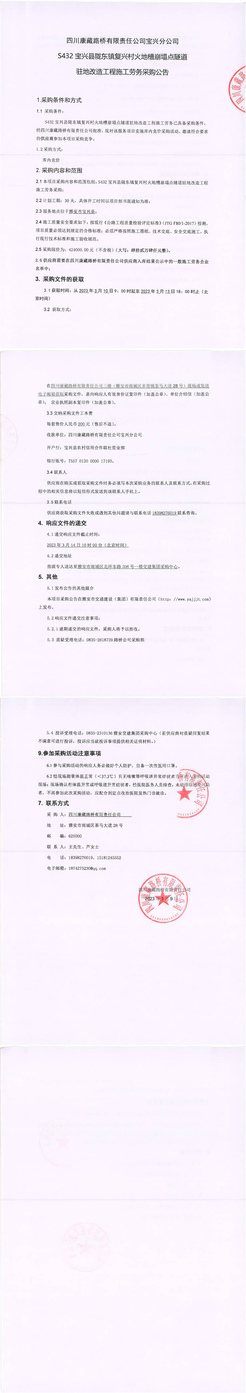 四川康藏路桥有限责任公司宝兴分公司S432宝兴县陇东镇复兴村火地槽崩塌点隧道驻地改造工程施工劳务采购公告