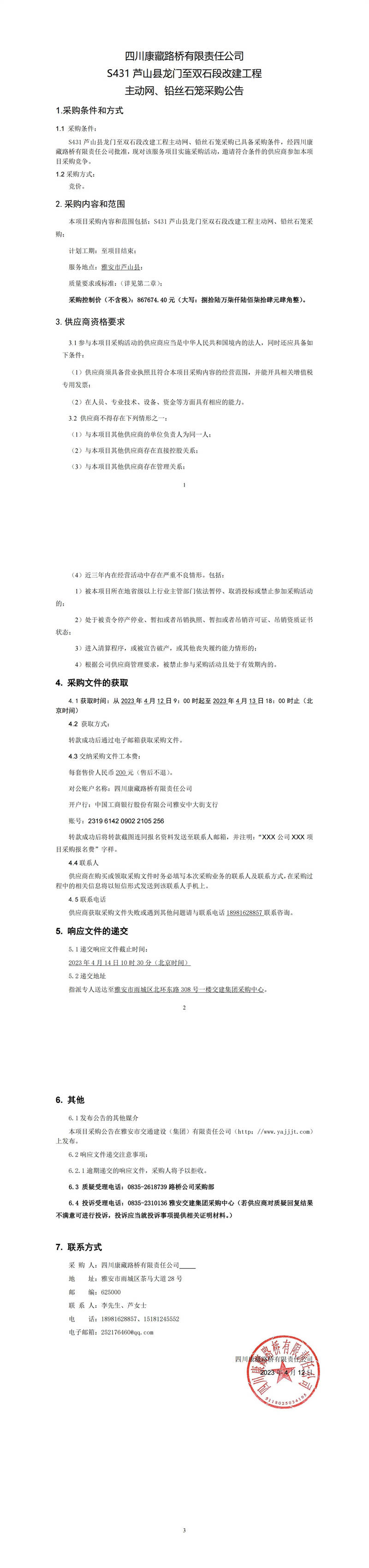 四川康藏路桥有限责任公司S431芦山县龙门至双石段改建工程主动网、铅丝笼采购公告