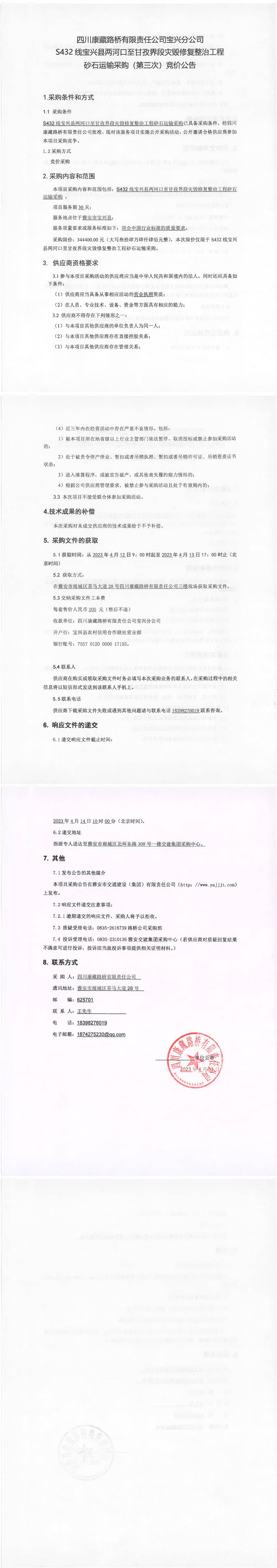 四川康藏路桥有限责任公司宝兴分公司S432宝兴县两河口至甘孜界段灾毁修复整治工程砂石运输采购(第三次)竞价公告
